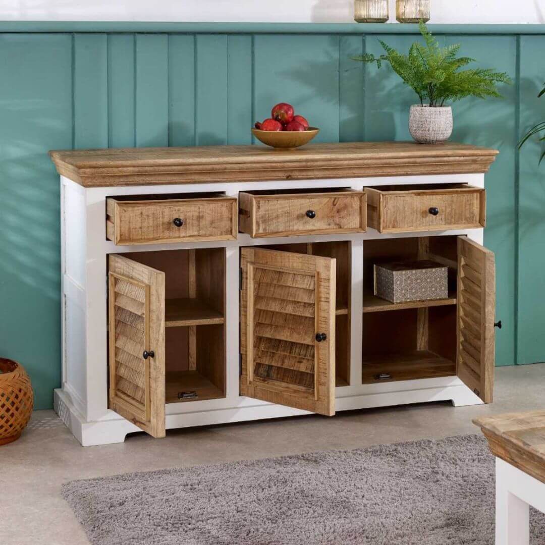 €559.00Introducing our Alfie Sideboard, a striking addition to your home decor. Handcrafted by skilled artisans in India using 100% eco-sourced mango wood, each piece is unique, showcasing the beauty of natural materials. The cabinet features a natural wood finish with a contrasting white color, exuding a blend of modern elegance and rustic charm. Its distinctive design ensures it stands out as a captivating furniture piece that will garner compliments no matter where it is placed in your home. This eye-catching sideboard will give a stunning focal point to your room. Showcase your photos, flowers, ornaments or can be useful in a dining room to store plates / cutlery etc. There are so many options for this piece within your home. Handmade by skilled craftsmen in India making each piece individual and unique. Embrace the individuality and elegance of our Alfie Sideboard. It is versatile and unique statement piece that promises to be a beloved and functional addition to your home. See the whole range here.