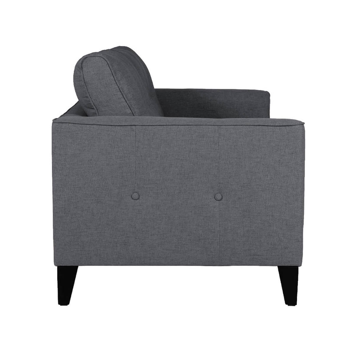 Our Astrid 3 seater sofa is an easy choice for the modern living space, its cool and comfortable. With its buttoned sides and back, with wenge finish legs, the functional design doesn’t skip on style. Additionally, the Astro is Crib 5 Certified, making it ideal for apartment living or student living spaces. The Astrid sofa range includes a three seat fixed sofa, two seat fixed sofa and armchair, all in a charcoal fabric upholstery. Click here to see the whole range.