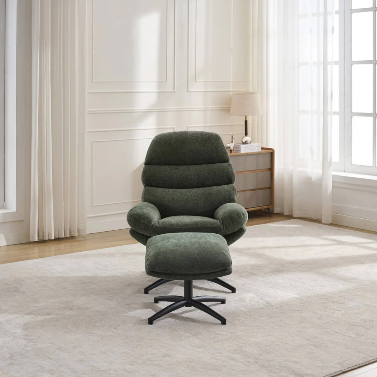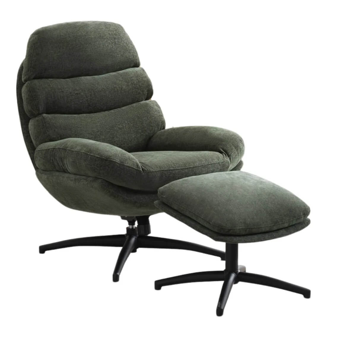 Our Clarke leisure chair with footstool is upholstered in soft fabric with stable metal bases on both parts. With its extra padded cushion headrest & footstool, the Clark offers superior support and comfort. The perfect chair for lounging in front of the TV, or with its 360-degree swivel rotation, being the center of the chat. Available in three colours.