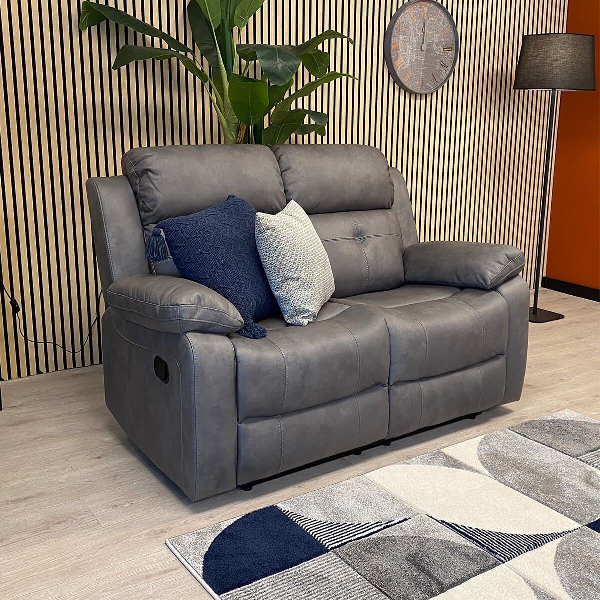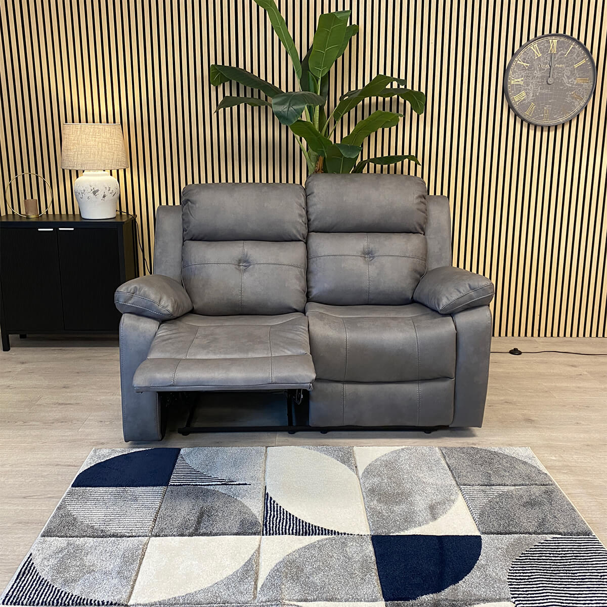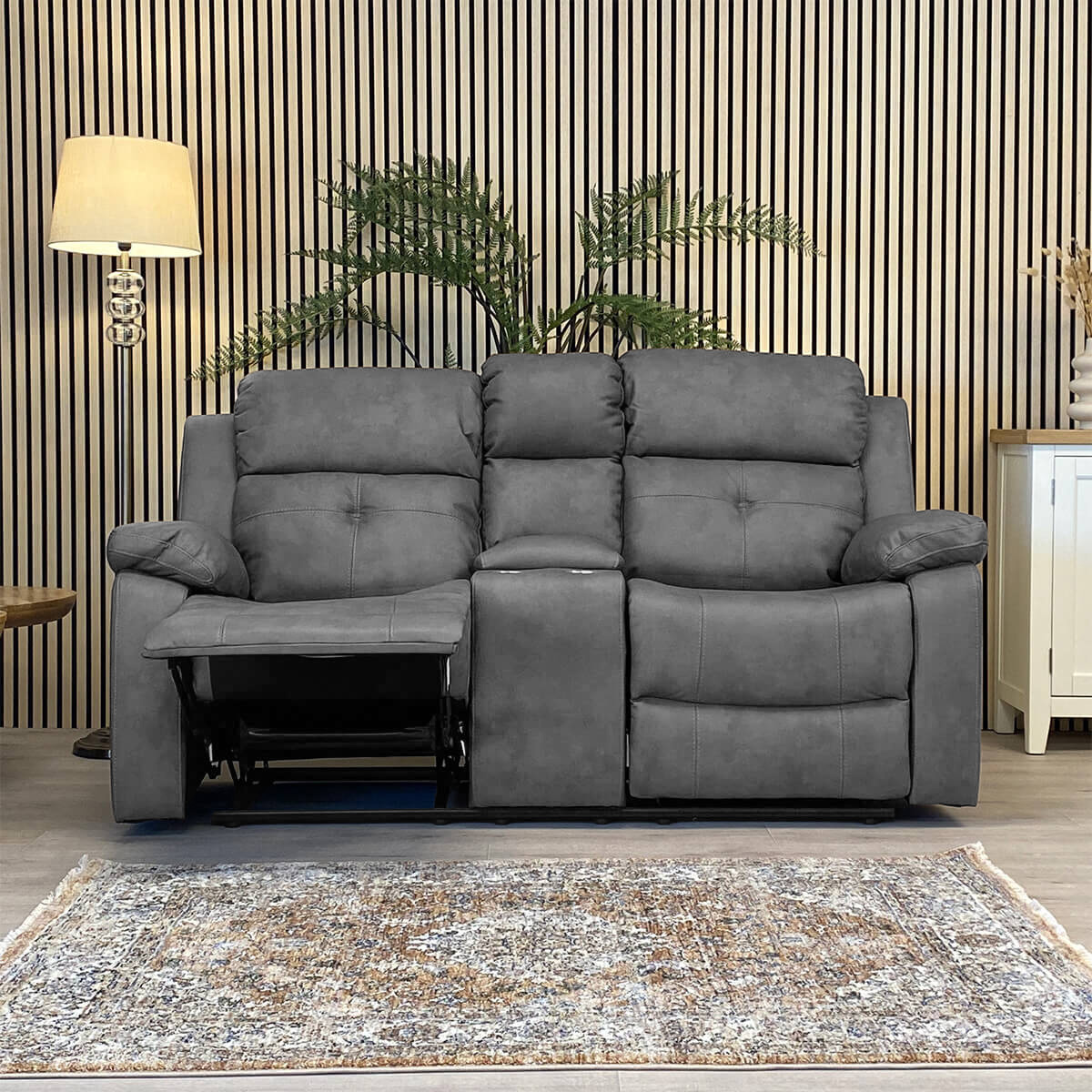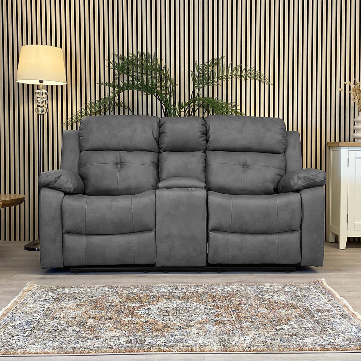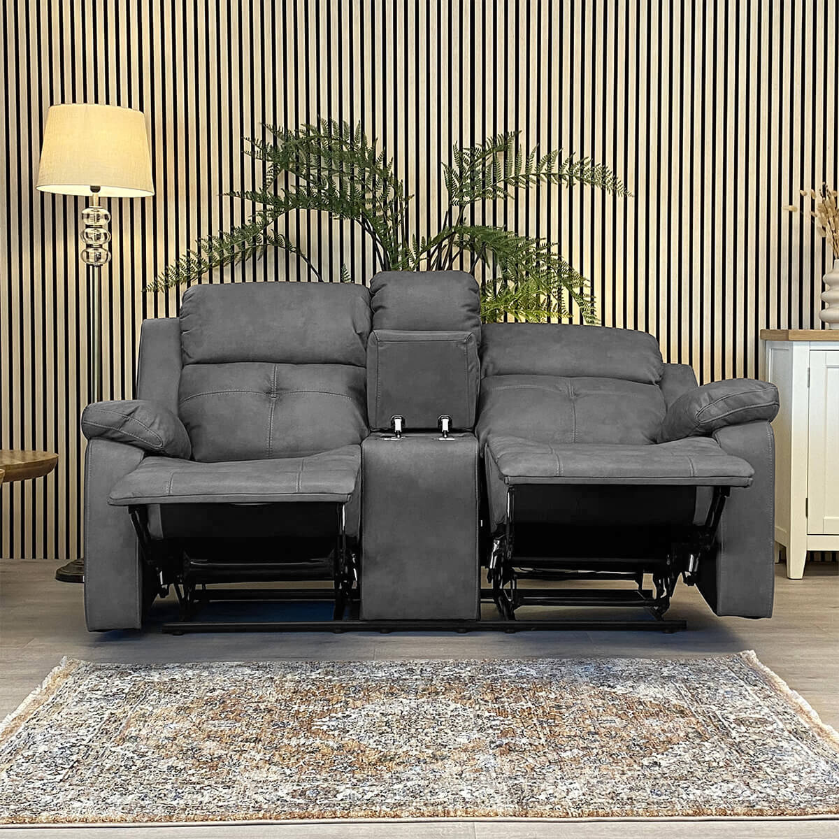 Our Gilmore 2 seater sofa has a sleek, modern design with padded armrests & button details featured in the cushions. With stunning design touches such as the buttoned detailing and parallel stitching. Available with or without a central console the Gilmore will complement any modern or contemporary living space. The manual reclining function, on both ends, will take relaxation to the next level. Available in Twilight Grey or Brown – click here to see the whole range.