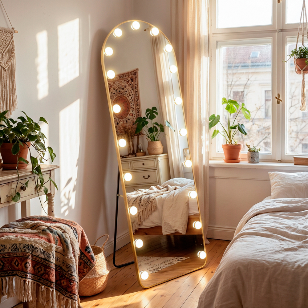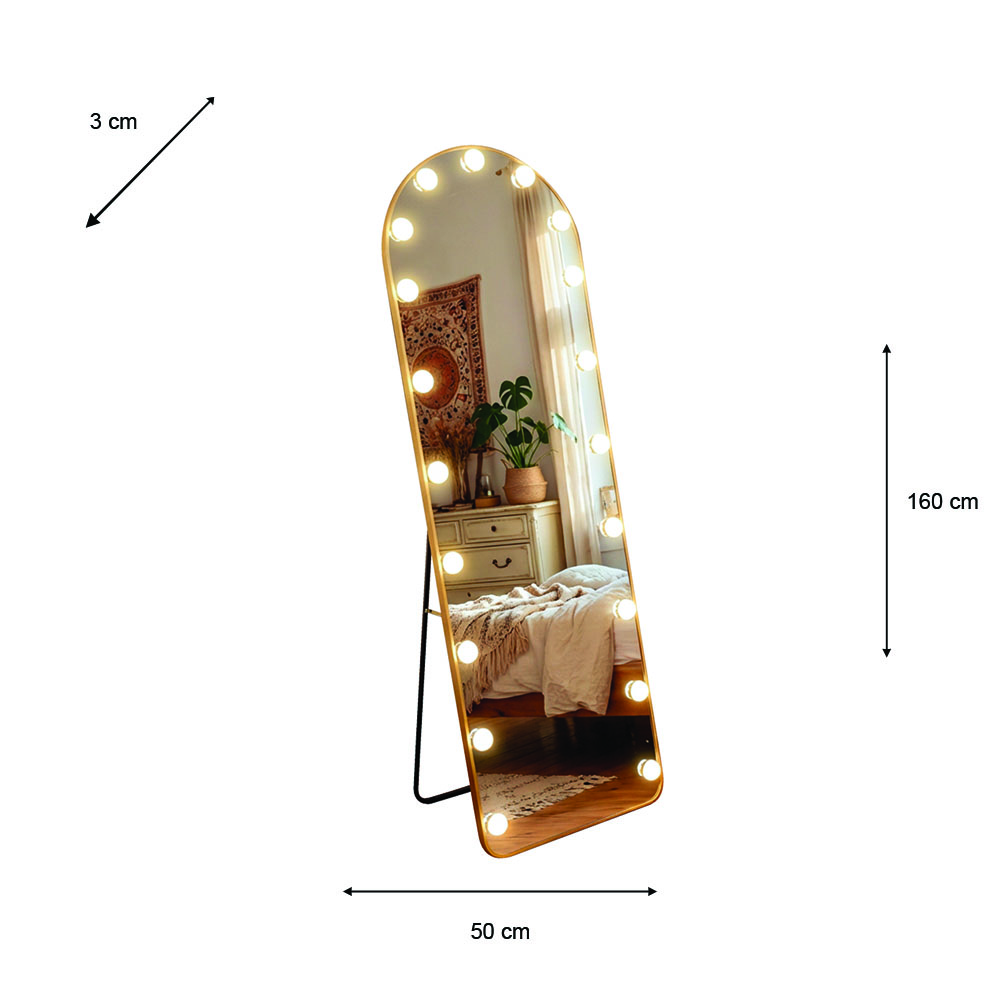 Our LED Bulb Modena Cheval Arch Mirror in gold measures 160cm in height, making it a striking and elegant addition to any room. Its tall design and gold finish add a touch of luxury and sophistication to your decor. Perfect for checking your outfit or enhancing the visual space in a room.