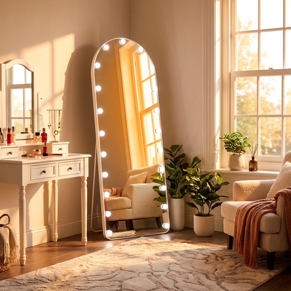 Our LED Bulb Modena Cheval Arch Mirror in white measures 160cm in height, making it a striking and elegant addition to any room. Its tall design and neutral finish add a touch of luxury and sophistication to your decor. Perfect for checking your outfit or enhancing the visual space in a room.