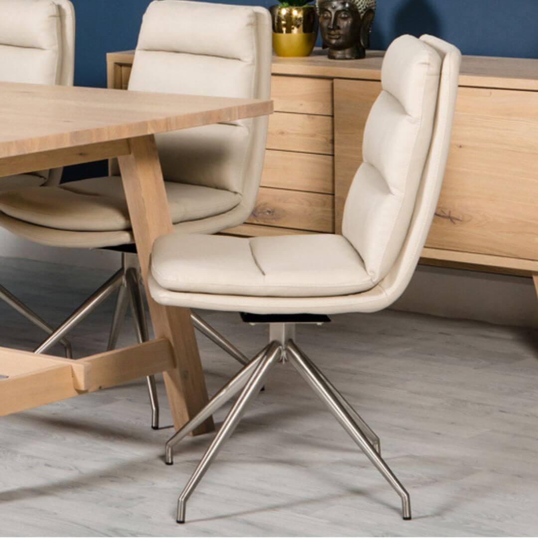Introducing our exceptional Nobo dining chair, where exquisite comfort, design-led style, and functionality converge to redefine dining experiences. Embodying a distinctive swivel feature, this chair exudes sociable charm and effortless coolness, elevating the ambiance of any dining space with an edgy flair. Standing proudly on its sunray base, available in black or stainless steel, the chair is a striking fusion of form and function. It is offered in a palette of faux leather colours, allowing for versatile mix-and-match possibilities or the option to create a cohesive, trend-led design statement with a single colour choice.