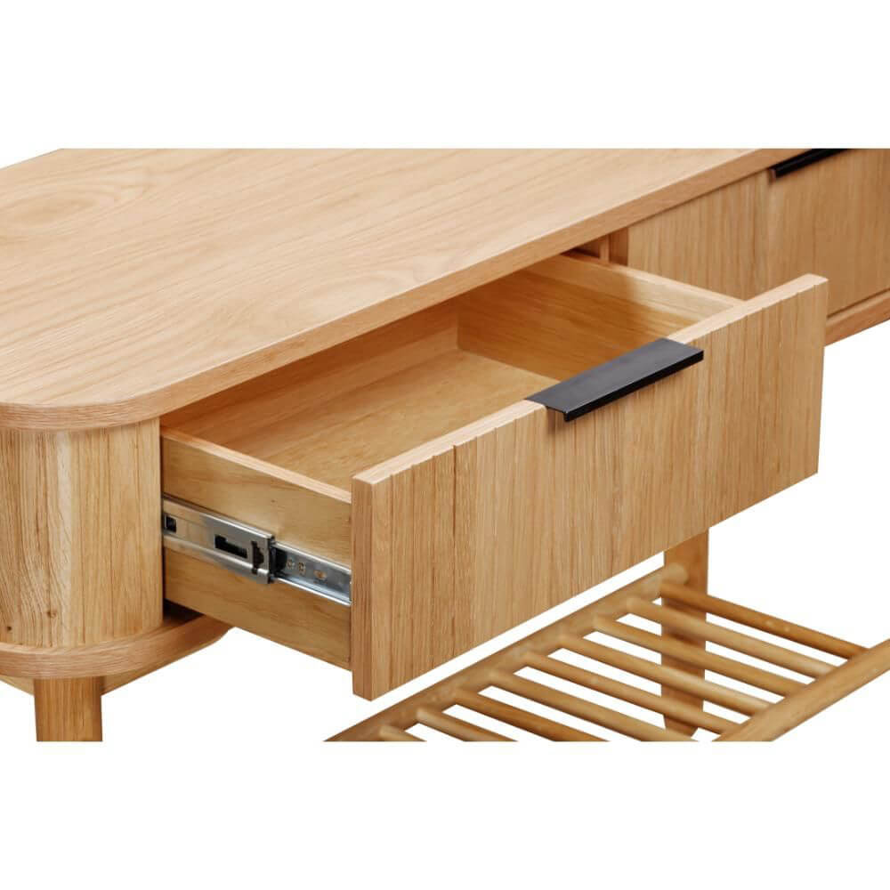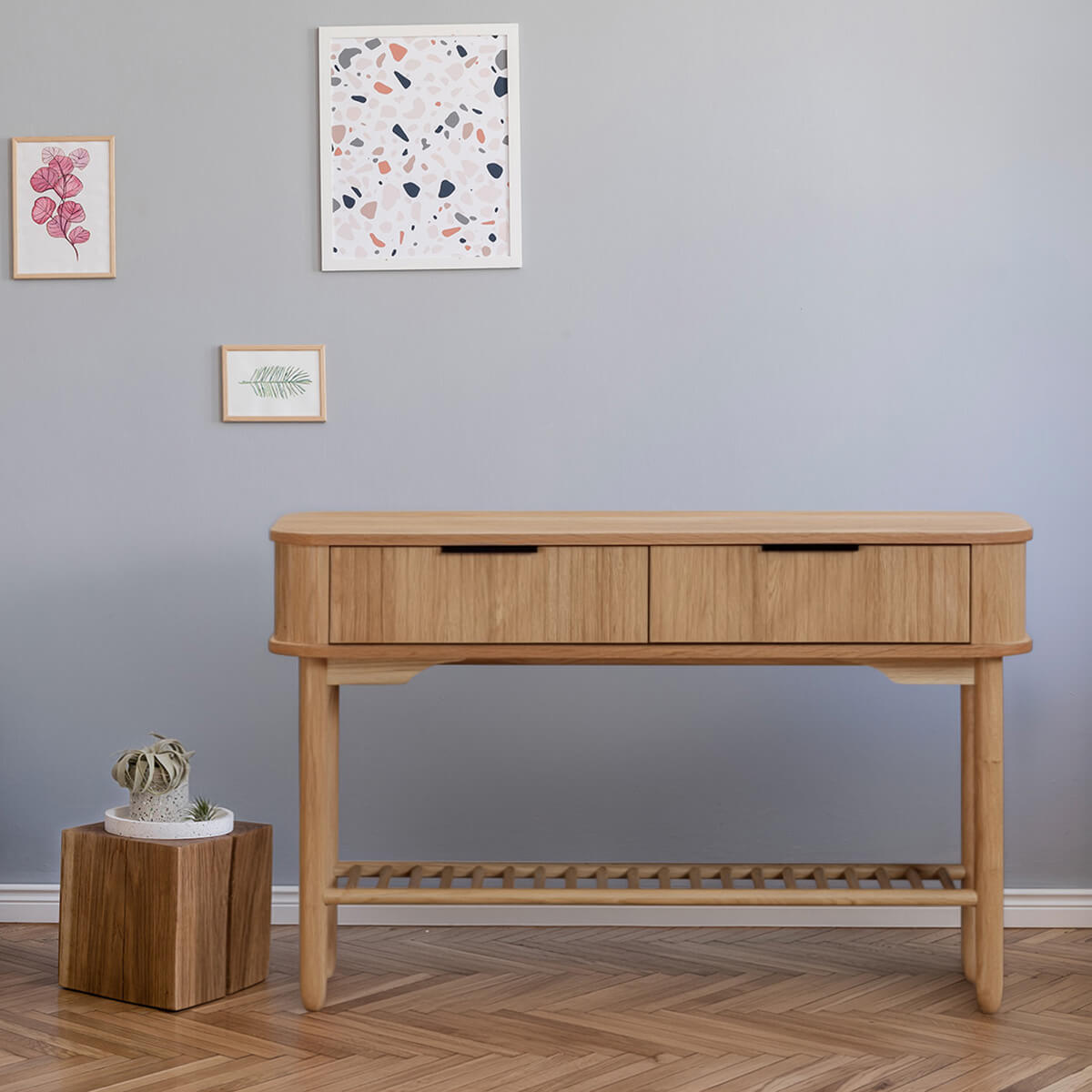 Our Vermont Console Table is finished with a natural oak veneer and has a graceful curved shape. The slim panelled drawers provide ample storage to keep your favourite living space clutter free. If you love the natural look in your home then our Vermont console table should be top of your shopping list.