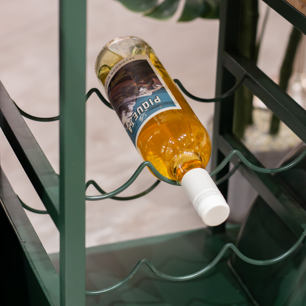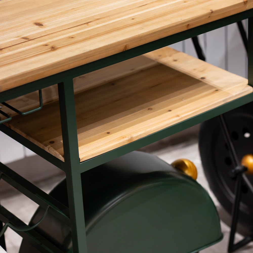 This Vespa Scooter Bar in Green is a unique bar counter/drinks cabinet that adds nostalgic charm to your home entertainment space, perfect for sophisticated living rooms or home bars. This one-of-a-kind piece of furniture combines eye-catching vintage design with everyday usefulness making it a takling point in any room. Made to look like the front of a classic Vespa scooter, it combines nostalgic style with strong construction. The metal frame in an industrial style and the warm wood tables and shelves make a timeless blend of style and function that works in modern, rustic, industrial, or eclectic spaces. The built-in glass holders and bottle rack make it easy to keep drinks organized and close at hand. Plus there are many wooden shelves that are perfect for holding mixers, decorations, or bar accessories. Great for hosting or everyday use.